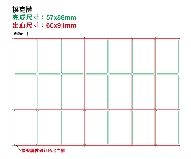 寫真噗克牌』樣本檔顯示紅色框為出血框,不能任意移動位置、調整大小或更改曲線造型。背景色塊、圖片或底紋圖案不可超過『紅色出血框』